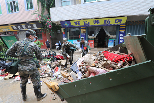 圖為武警第二機(jī)動總隊某支隊救援官兵在一線清運垃圾。薛東東 攝