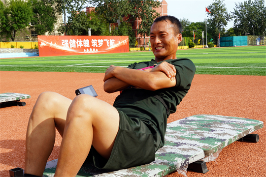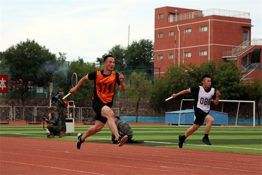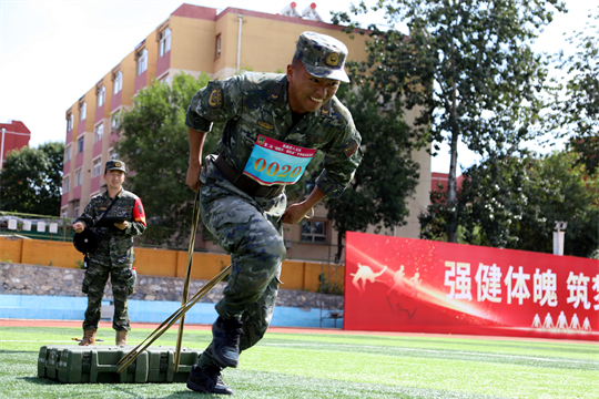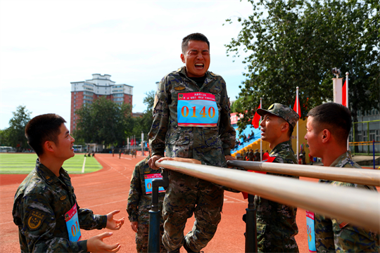 “各就位,預(yù)備,嘭……”伴隨著發(fā)令槍響,4×400米接力賽開始。參賽官兵猶如離弦之箭迅速沖出起跑線,第一棒官兵低頭猛沖,接棒官兵焦急回望,觀賽官兵吶喊助威,現(xiàn)場氛圍緊張熱烈。與此同時,各競賽課目相繼展開,20×60米考驗團隊協(xié)作和速度;徒手、負(fù)重組合考驗爆發(fā)力和協(xié)調(diào)力;器械課目考驗技能技巧和官兵耐力……