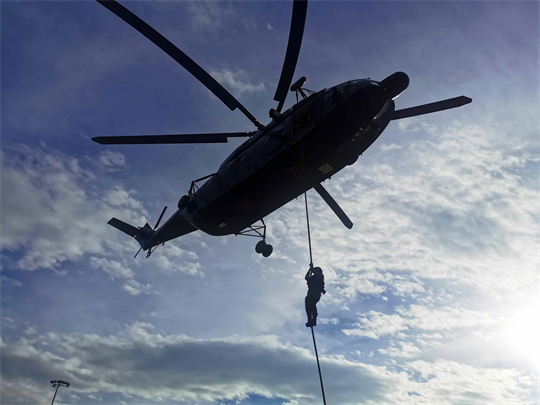 圖為在實(shí)戰(zhàn)化演練中,武警第二機(jī)動(dòng)總隊(duì)某支隊(duì)五中隊(duì)官兵從直升機(jī)上快速索降。楊延國 攝