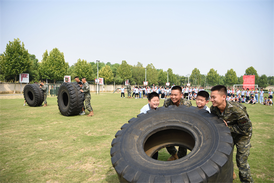 圖為在武警合肥支隊執(zhí)勤某大隊營區(qū),小學(xué)生與戰(zhàn)士們組隊進行翻輪胎比賽。