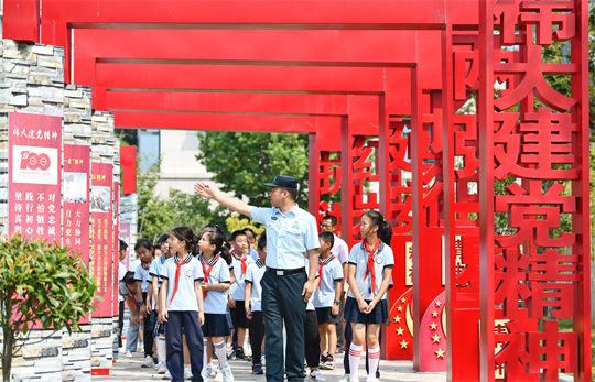 圖為在武警合肥支隊執(zhí)勤某大隊營區(qū),小學(xué)生在參觀黨史軍史長廊。