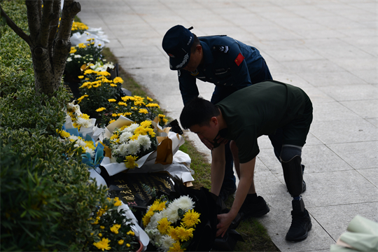 海警執(zhí)法員們一邊清理著汪曉龍烈士墓碑旁的雜草,一邊擦拭著墓碑?!鞍肽甓嗔?,我們都非常想念你,你看,圣森和泳熙也來(lái)了。這次,我們執(zhí)法小組全員都到齊?!睜柡螅蠹伊嘘?duì)走到汪曉龍烈士墓碑前,依次敬獻(xiàn)鮮花,面對(duì)烈士墓碑沉痛哀悼。