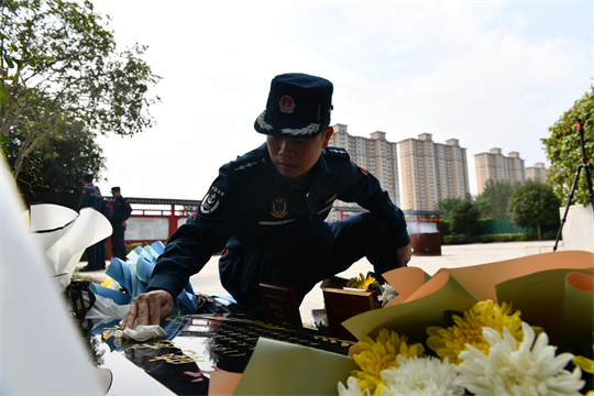 隨后,海警執(zhí)法員趕赴太和縣萬(wàn)壽山烈士紀(jì)念碑廣場(chǎng),汪曉龍烈士的墓碑安放在這里。