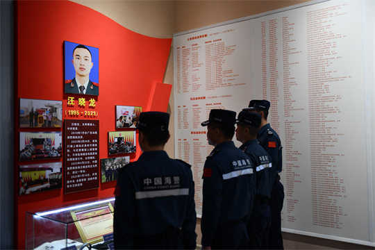 “這位是汪曉龍烈士,是我們阜陽(yáng)太和人,生前是廣東海警局執(zhí)法員?!痹谔涂h烈士紀(jì)念館里,講解員講述著汪曉龍生前的先進(jìn)事跡,在場(chǎng)人員聆聽(tīng)著英烈事跡,看著館里展陳的汪曉龍烈士生前的遺物和工作照片,往事一幕幕浮現(xiàn)在廣東海警執(zhí)法員腦海中。