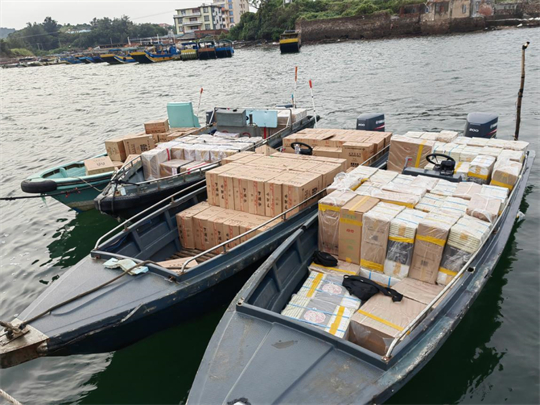 經(jīng)檢查,5艘涉案摩托艇及所載貨物均無合法手續(xù)及相關(guān)證明,涉嫌走私。經(jīng)清點,該5批貨物共有中華、荷花、芙蓉王、黃鶴樓、紅雙喜等20余類品牌香煙1.2萬余條,案值約460萬元。