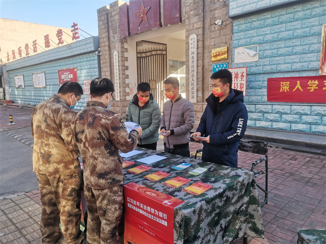 圖為河北省清河縣人武部聯(lián)合駐地法院、檢察院、退役軍人事務(wù)局向全體官兵和社會民眾進行普法宣傳。耿月磊 攝