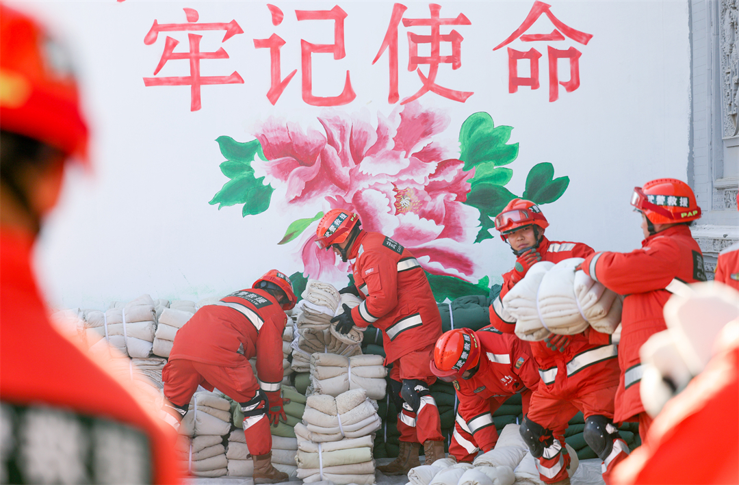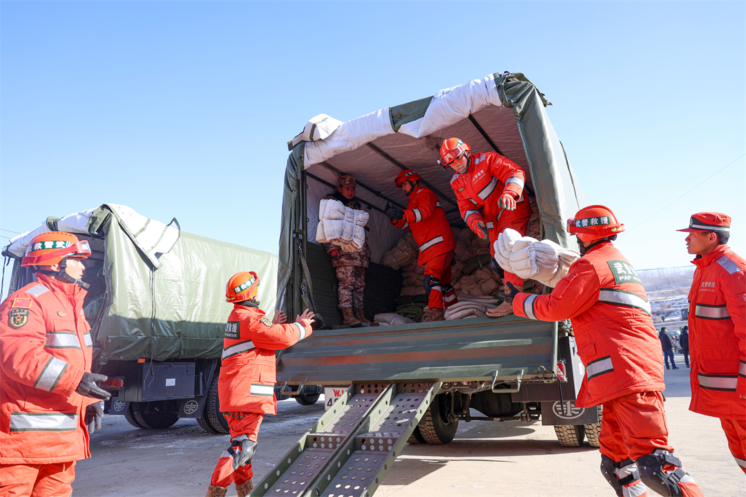 圖為12月20日,武警甘肅總隊官兵在甘肅省臨夏回族自治州積石山縣劉集鄉(xiāng)肖家村為災(zāi)民提供御寒物資。