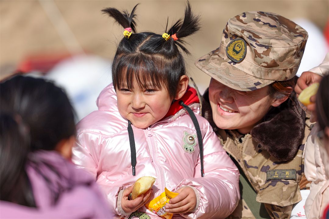 圖為12月20日,武警甘肅總隊醫(yī)院醫(yī)療分隊一名醫(yī)生和甘肅省臨夏回族自治州積石山縣劉集鄉(xiāng)陽屲村的小朋友交流互動。