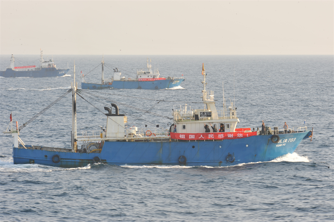 圖為今年10月22日,第45批護(hù)航編隊(duì)烏魯木齊艦、東平湖艦為10艘中國(guó)漁船進(jìn)行護(hù)航。王遠(yuǎn)方 攝
