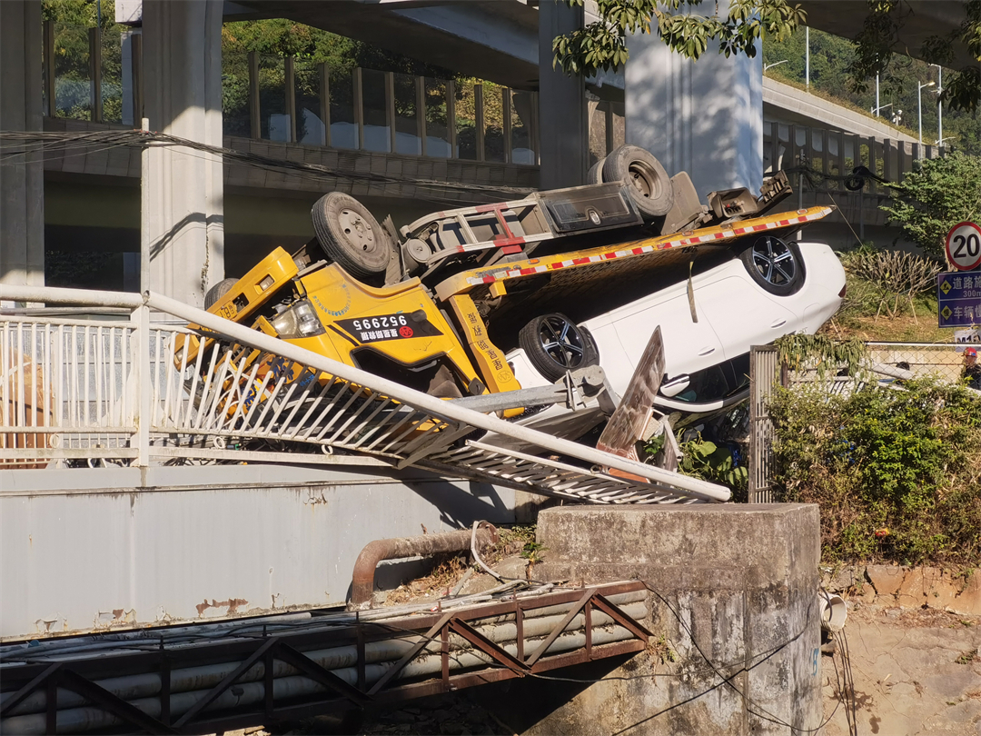 12月24日15時許,在廣東海警局駐深圳某部大門前,一輛裝載私家車的東風道路救援車在河邊發(fā)生側(cè)翻,車內(nèi)3名人員被困車中,車體壓在橋旁護欄上,隨時有掉落河中的危險,情況十分危險。