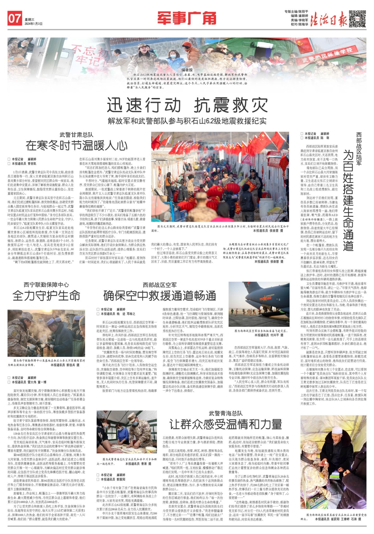 積石山6.2級(jí)地震造成重大人員傷亡,房屋、水、電等基礎(chǔ)設(shè)施受損,解放軍和武警部隊(duì)官兵第一時(shí)間奔赴現(xiàn)場(chǎng)抗震救援。他們以最快的速度組織搜救,想方設(shè)法排查險(xiǎn)情、救治傷員、打通生命通道、安置受災(zāi)群眾。這個(gè)冬天,人民子弟兵用溫暖人心的行動(dòng),詮釋著“為人民服務(wù)”的宗旨。