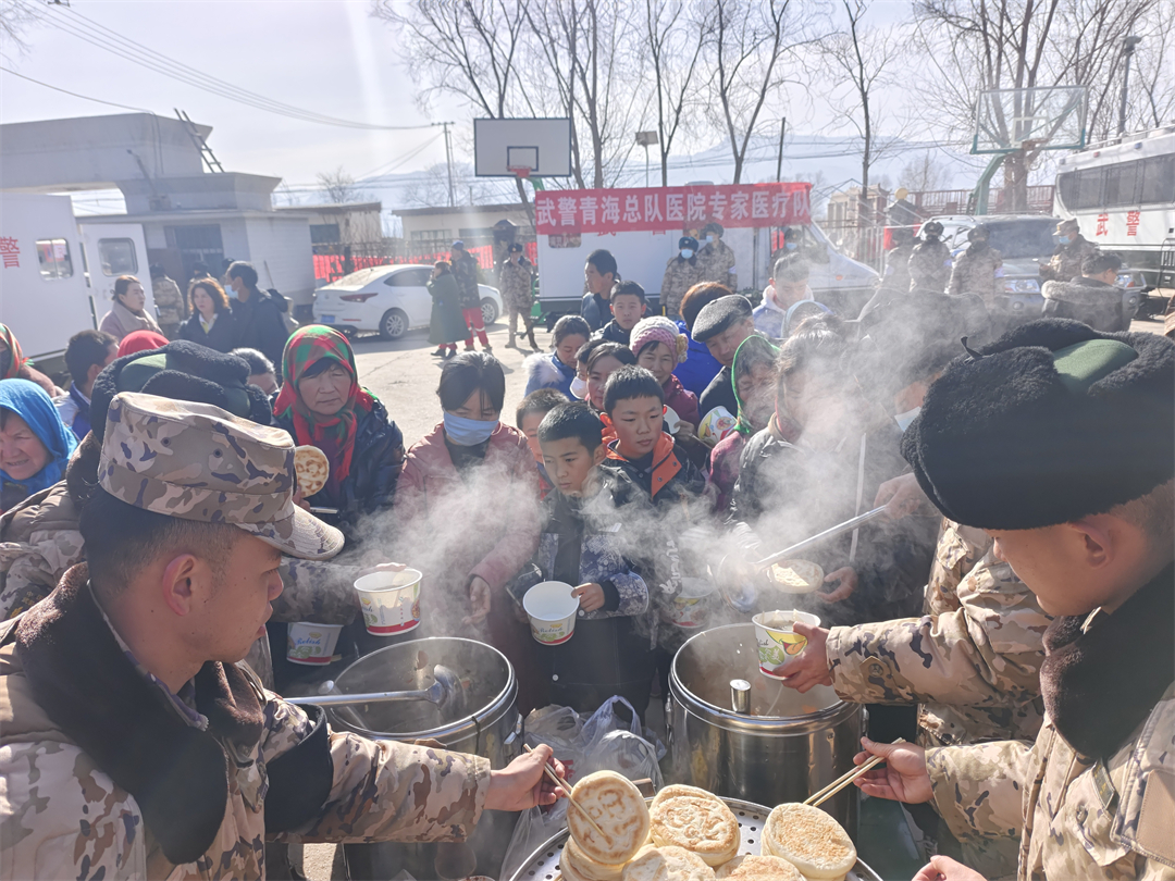 為了讓群眾吃飽吃好,武警青??傟?duì)20余名炊事員制作熱食。熱氣騰騰的羊肉粉湯做熟了,配上熱乎乎的餅子,約200名群眾吃上了災(zāi)后第一頓熱乎飯。炊事員們一日三餐為群眾提供充足的熱食,一名老大爺感動(dòng)得老淚縱橫:“身子暖和了,心里更暖……”
