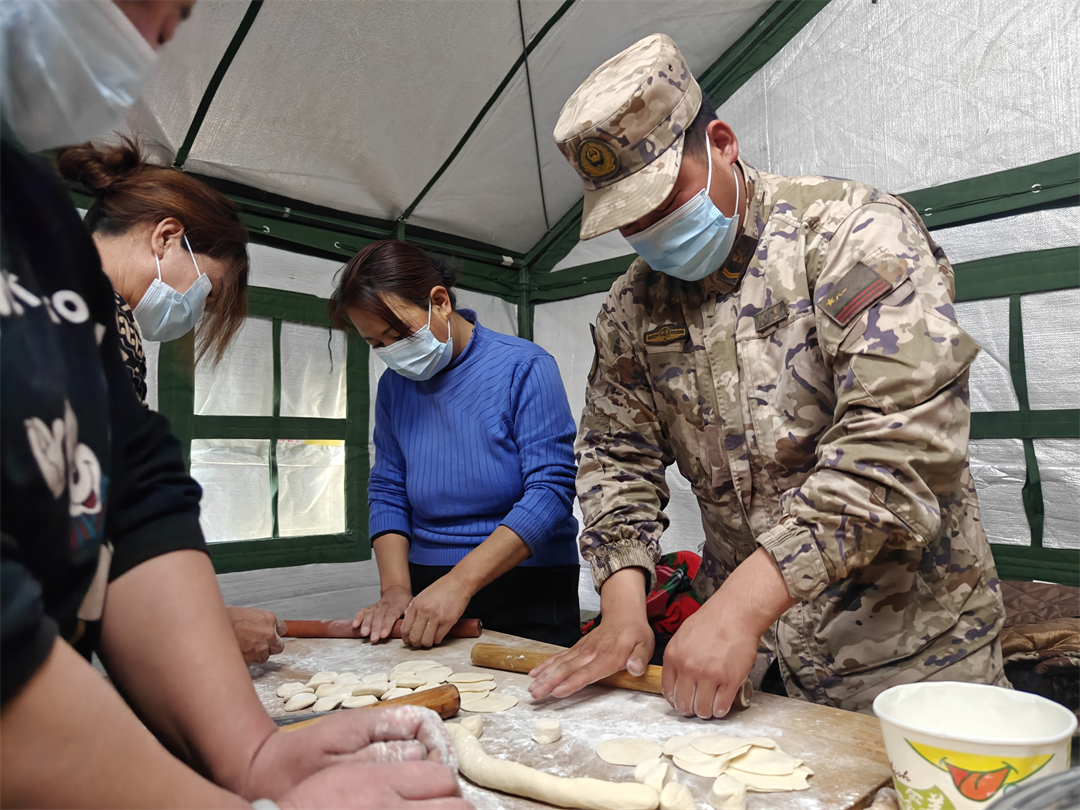 “小伙子有對(duì)象了沒?”在青海省海東市民和縣中川鄉(xiāng)安置點(diǎn)帳篷里,武警青??傟?duì)炊事員和群眾一邊包餃子,一邊聊天,有阿姨給單身戰(zhàn)士介紹對(duì)象,大家有說有笑,現(xiàn)場(chǎng)充滿溫情。