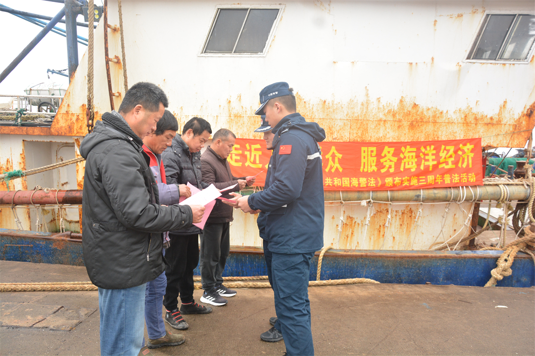 執(zhí)法員走進(jìn)碼頭、漁港、涉海工程等地,通過懸掛橫幅、設(shè)置展板、發(fā)放傳單等方式,向轄區(qū)群眾講釋海警法主要內(nèi)容、普及海上安全常識,以及介紹95110海上報(bào)警服務(wù)平臺功能作用。