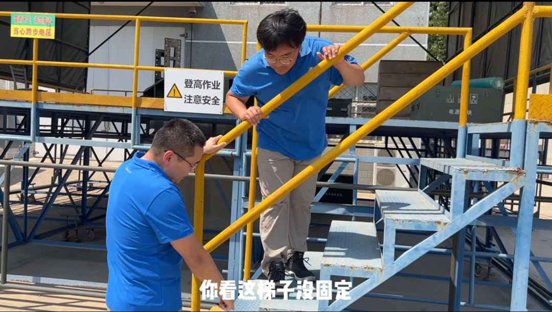 “這個梯子沒固定,上下平臺很容易摔倒?!币曨l中,小翟叫住正準備登上平臺的小劉,并帶著他一起將四個輪子鎖緊。這是在調(diào)試平臺測試時容易被忽略的一處隱患,視頻通過糾錯的方式,講解登高作業(yè)的操作規(guī)范,讓大家更容易入腦入心。