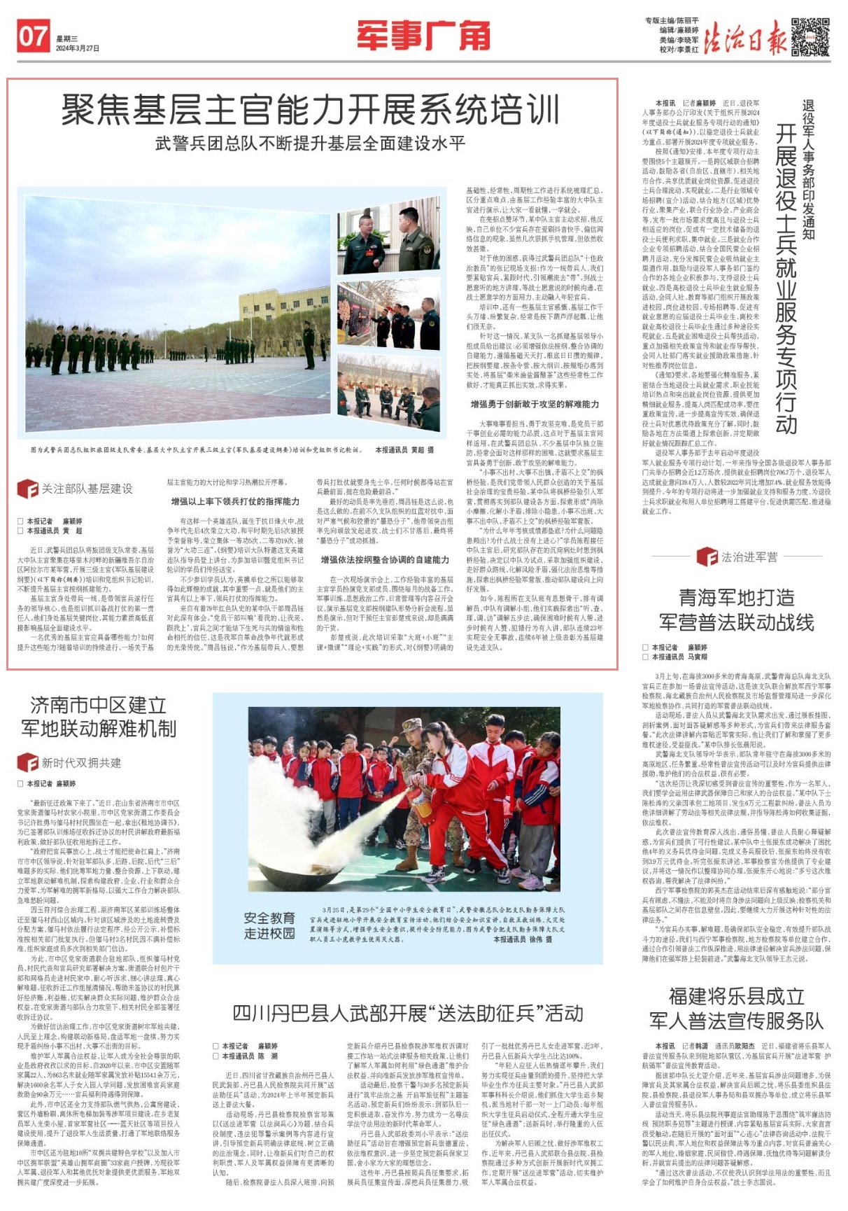 “小事不出村、大事不出鎮(zhèn)、矛盾不上交”的楓橋經(jīng)驗(yàn),是我們黨帶領(lǐng)人民群眾創(chuàng)造的關(guān)于基層社會治理的寶貴經(jīng)驗(yàn)。某中隊(duì)將楓橋經(jīng)驗(yàn)引入軍營,貫徹落實(shí)到部隊(duì)建設(shè)各方面,探索形成“消除小摩擦、化解小矛盾、排除小隱患,小事不出班、大事不出中隊(duì)、矛盾不上交”的楓橋經(jīng)驗(yàn)軍營版。