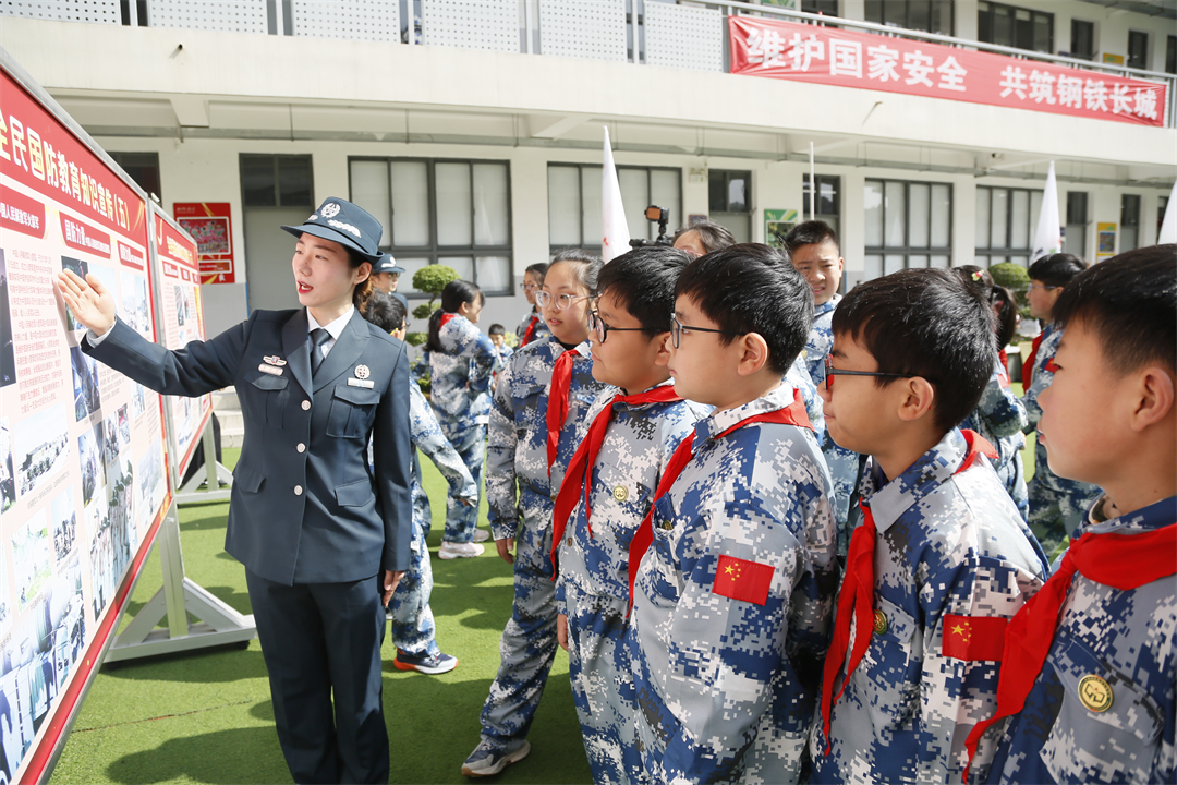 圖為2023年4月7日,南京警備區(qū)進校園開展國防教育,文職人員給小學生介紹國防知識。張永祥 攝