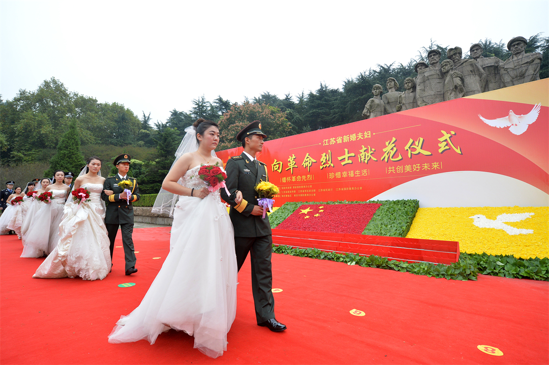 圖為駐寧某部干部劉洋(右一)和妻子劉芮(右二)參加新婚夫婦向革命烈士獻花時的場景。肖剛 攝