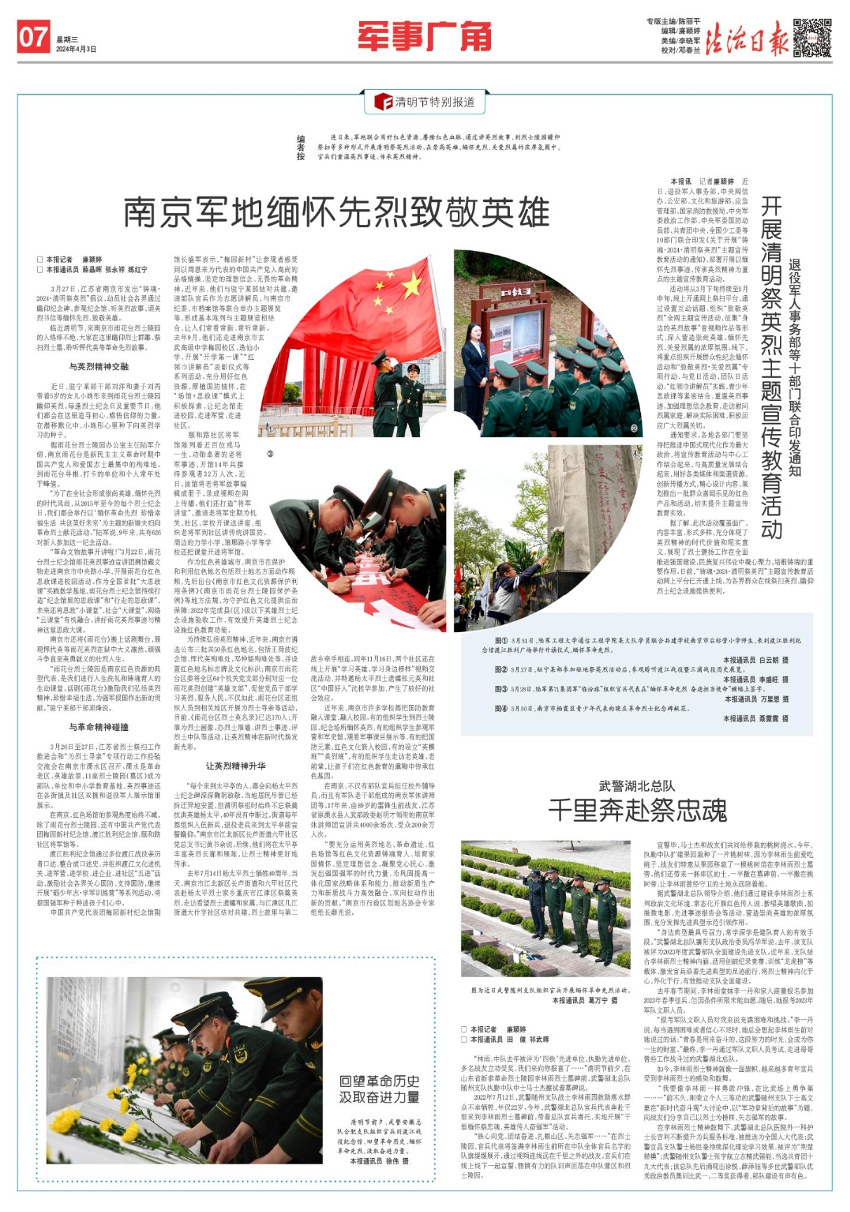3月27日,江蘇省南京市發(fā)出“鑄魂·2024·清明祭英烈”倡議,動員社會各界通過瞻仰紀念碑、參觀紀念館、聽英烈故事、誦英烈書信等緬懷先烈、致敬英雄。