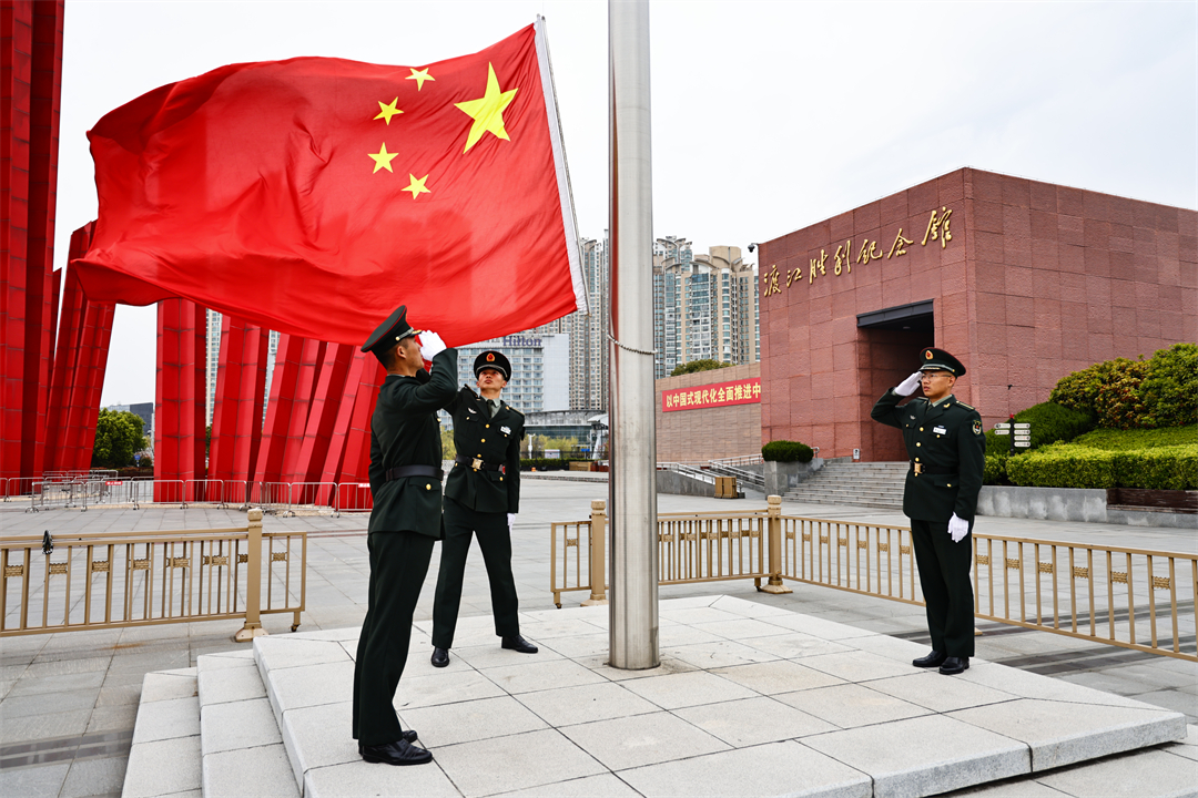 圖為3月31日,陸軍工程大學通信工程學院某大隊學員聯(lián)合共建學校南京市后標營小學師生,來到渡江勝利紀念館渡江勝利廣場舉行升旗儀式,緬懷革命先烈。白云朗 攝