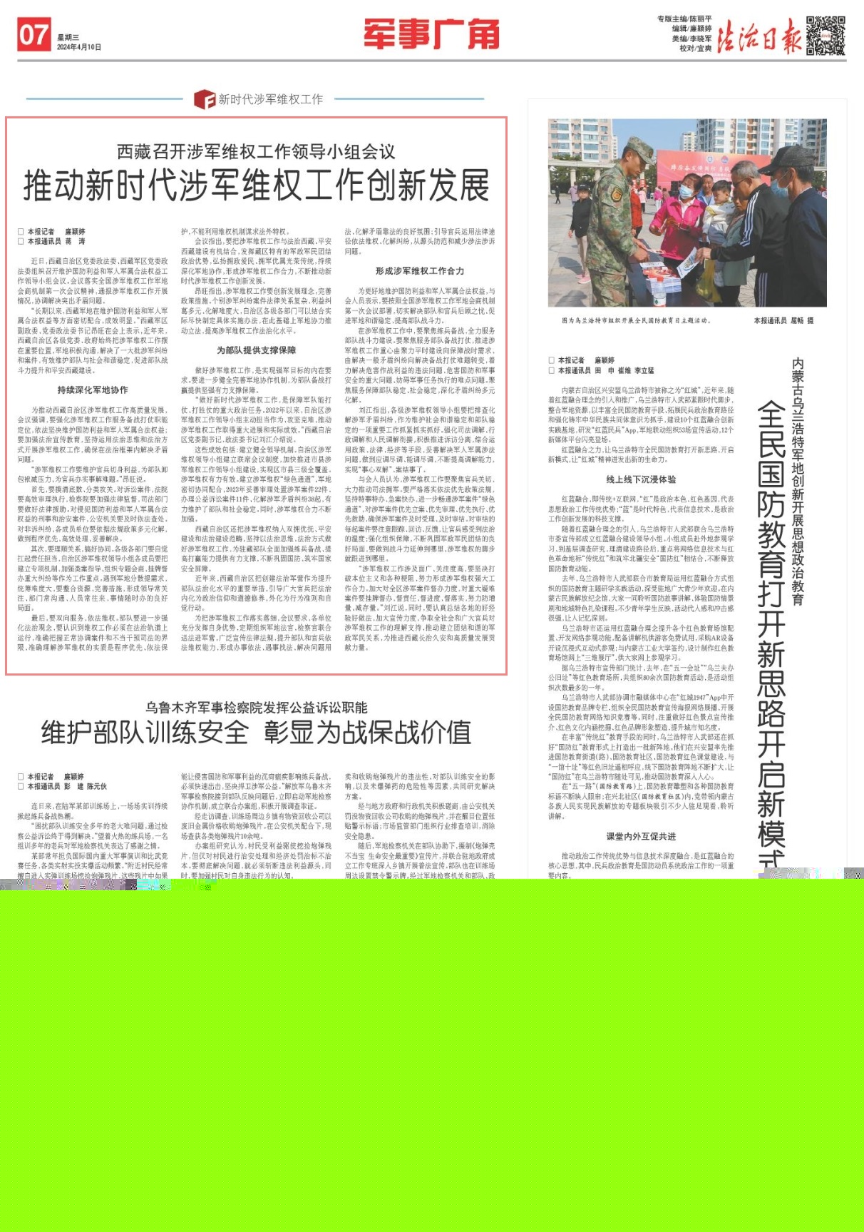 西藏自治區(qū)還把涉軍維權(quán)納入雙擁優(yōu)撫、平安建設(shè)和法治建設(shè)范疇,堅(jiān)持以法治思維、法治方式做好涉軍維權(quán)工作,為駐藏部隊(duì)全面加強(qiáng)練兵備戰(zhàn)、提高打贏能力提供有力支撐,不斷鞏固國(guó)防、筑牢國(guó)家安全屏障。