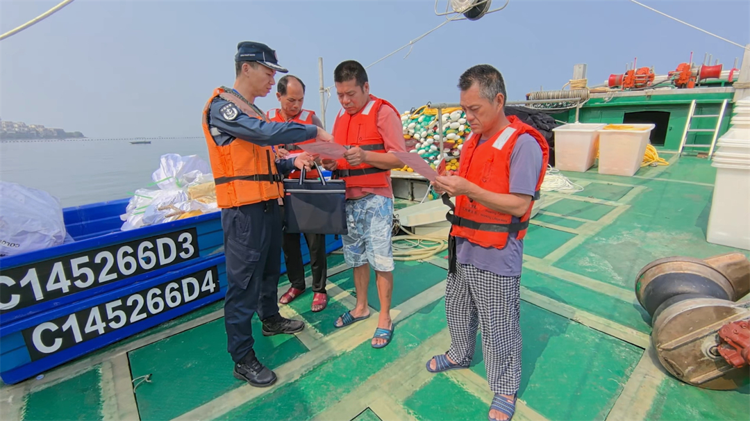 圖為執(zhí)法員向漁民發(fā)放國家安全宣傳單。