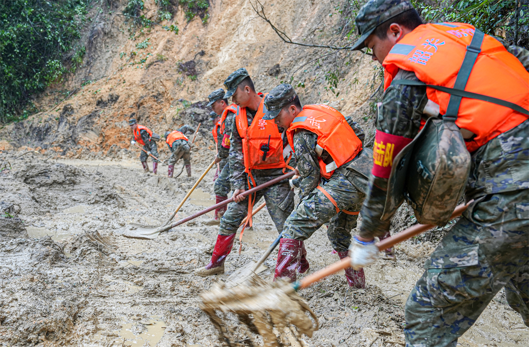 圖為武警廣東總隊韶關(guān)支隊官兵清理道路堵塞路段淤泥,為救援車輛進(jìn)入保駕護(hù)航。