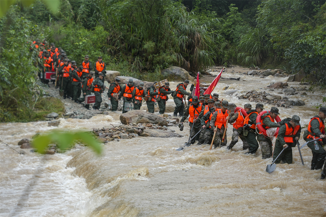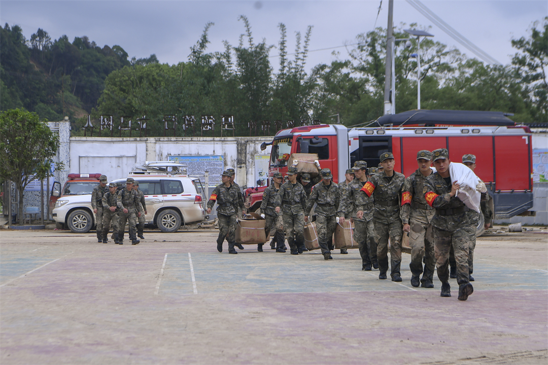 圖為武警廣東總隊(duì)韶關(guān)支隊(duì)官兵攜帶物資前往受災(zāi)地域。