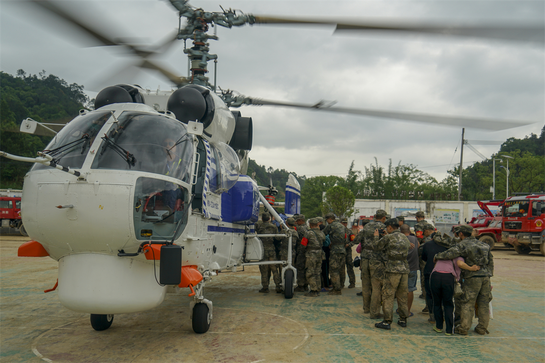 圖為武警廣東總隊(duì)韶關(guān)支隊(duì)官兵護(hù)送受災(zāi)群眾登機(jī),前往安全地域。