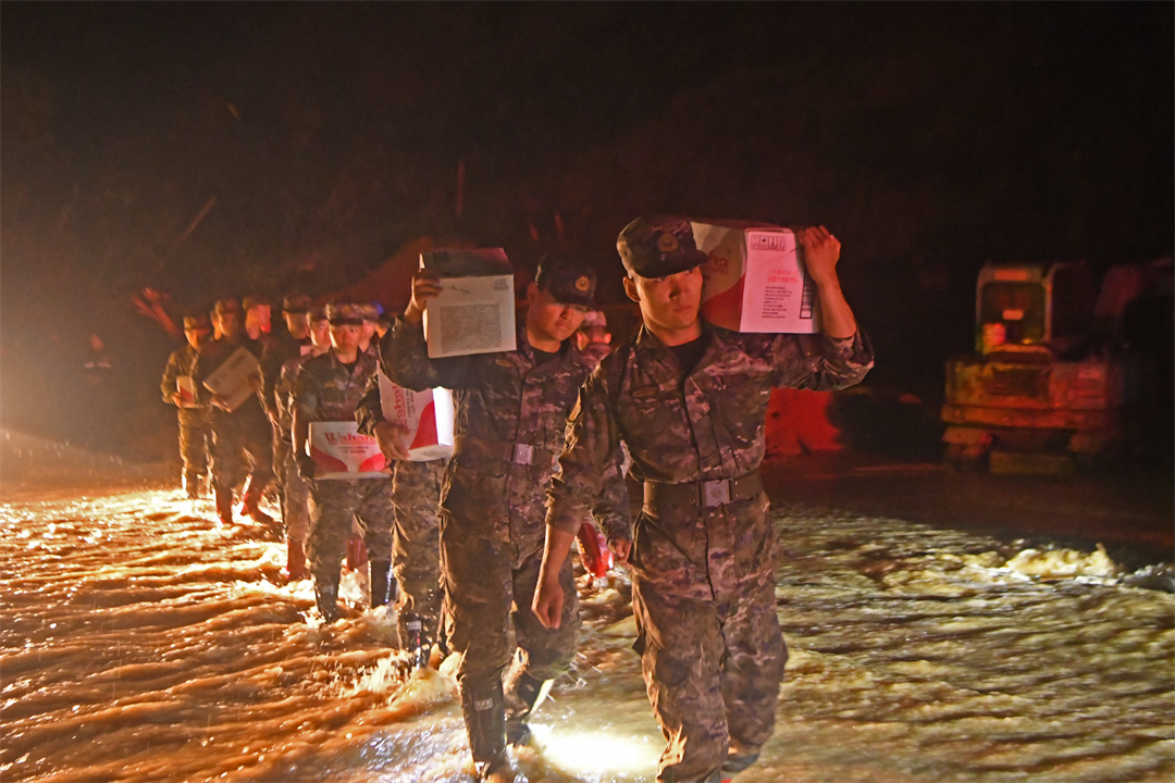 22日夜間,由于能見(jiàn)度不佳,道路搶通工作暫時(shí)停止,武警官兵采取接力的方式,將直升機(jī)、運(yùn)輸車(chē)等交通工具送達(dá)的物資進(jìn)行二次轉(zhuǎn)運(yùn),目前能保證受災(zāi)群眾基本的飲用水和食物需求。