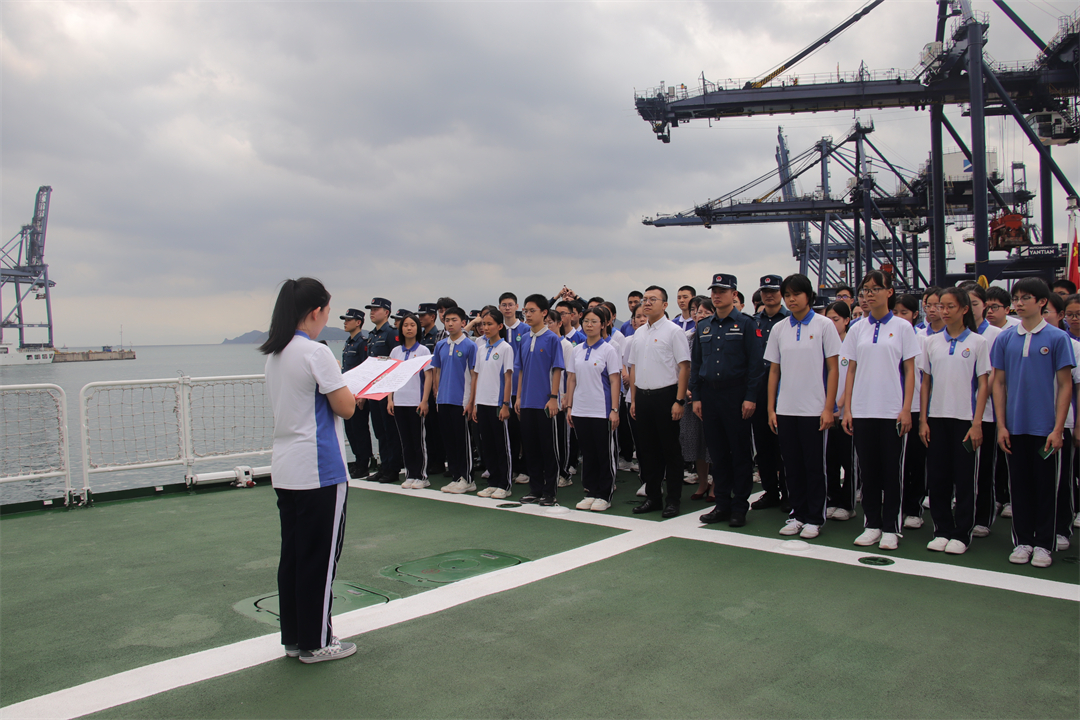 入團(tuán)儀式在嘹亮的國歌聲中拉開序幕。全體人員在深圳海警局德洲艦甲板上肅立,高聲齊唱國歌。隨后,與會領(lǐng)導(dǎo)為新團(tuán)員頒發(fā)團(tuán)徽和團(tuán)員證。全體團(tuán)員面向團(tuán)旗莊嚴(yán)宣誓,兩名團(tuán)員代表作了慷慨激昂的發(fā)言。最后,羅湖區(qū)教育局領(lǐng)導(dǎo)致辭寄語,勉勵全體團(tuán)員為中華民族偉大復(fù)興不懈奮斗。