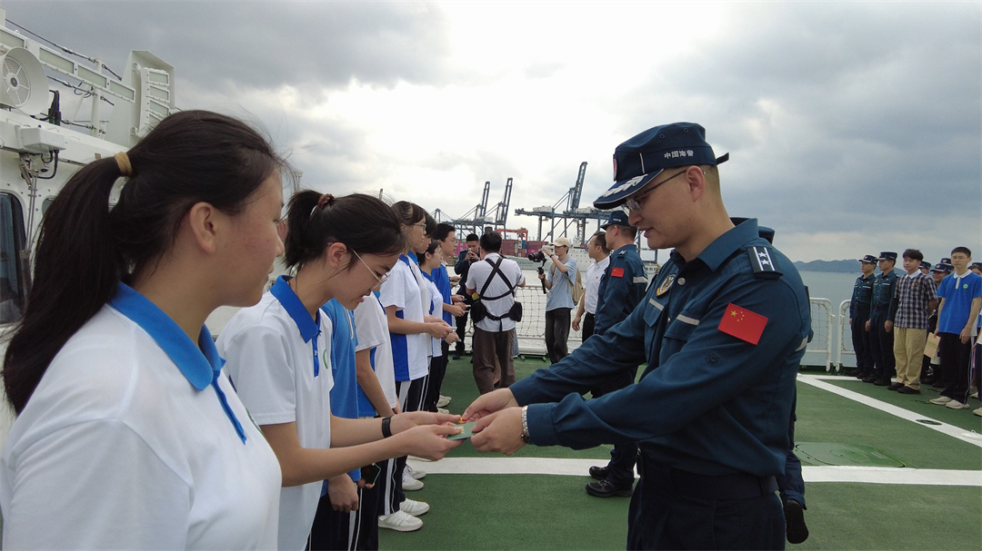 圖為海警執(zhí)法員向新團(tuán)員頒發(fā)團(tuán)員證書。