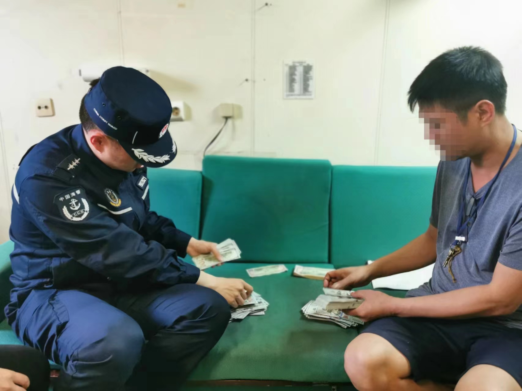 圖為執(zhí)法員對(duì)違法所得的美金紙幣進(jìn)行清點(diǎn)。
