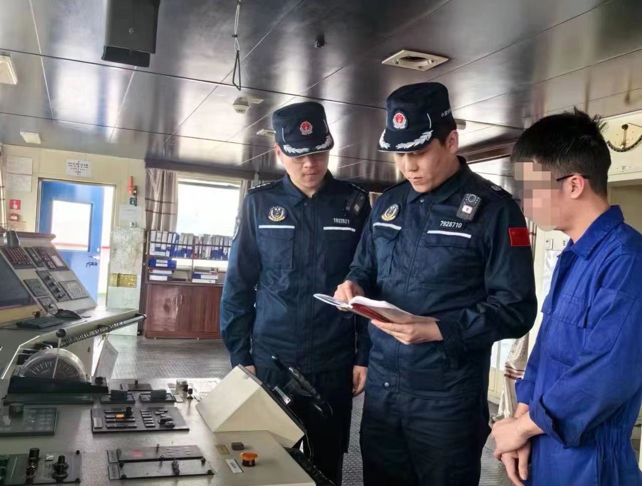 圖為執(zhí)法員對(duì)外籍貨輪進(jìn)行現(xiàn)場檢查。
