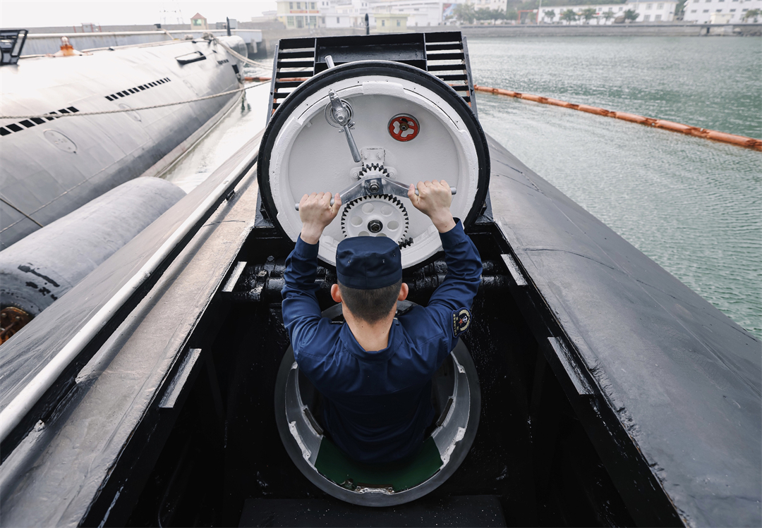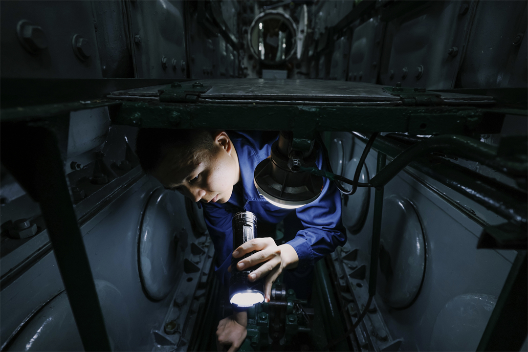圖為艇員對潛艇進(jìn)行例行檢查。