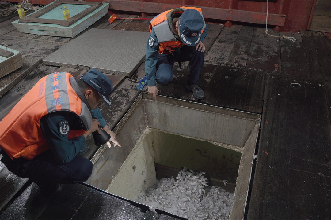 圖為海警執(zhí)法員對查獲的漁獲物進行檢查。