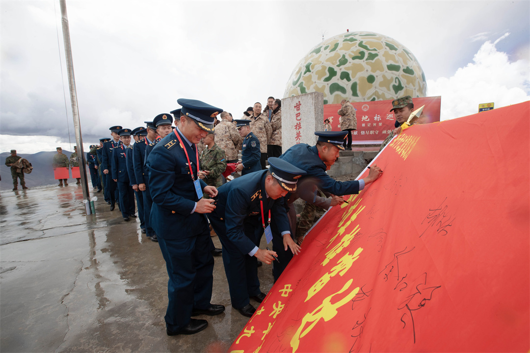 圖為“甘巴拉英雄雷達(dá)站”授稱30周年之際,甘巴拉基層代表登上5374米的陣地,在軍旗上簽名。溫志軍 攝
