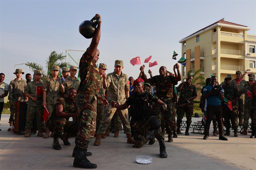 圖為壺鈴抓舉比賽中,坦方官兵正在為中方選手加油打氣。羅暄 攝