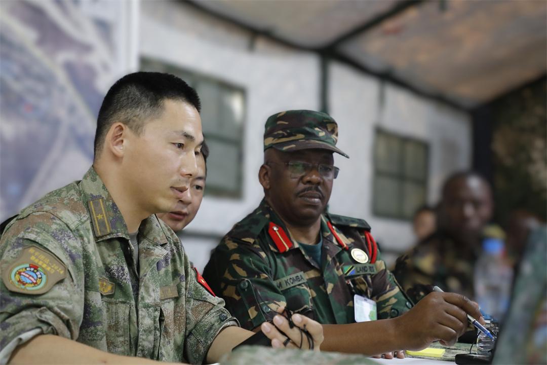 中坦雙方指揮人員共聚一室,同步掌握戰(zhàn)場(chǎng)態(tài)勢(shì),共同組織作戰(zhàn)籌劃,在研判情況、定下決心、制定計(jì)劃、組織協(xié)同等環(huán)節(jié)充分溝通,精準(zhǔn)調(diào)控任務(wù)部隊(duì)行動(dòng)。雙方指揮員針對(duì)指揮處置重難點(diǎn)問(wèn)題和臨機(jī)導(dǎo)調(diào)情況不時(shí)提出質(zhì)詢,雙方指揮編組人員隨即展開(kāi)臨機(jī)籌劃、提出處置建議,整個(gè)過(guò)程精準(zhǔn)高效、順暢有序。