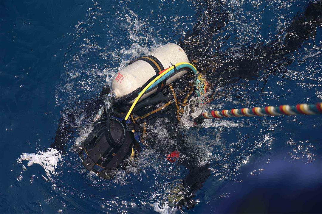 圖為潛水員準(zhǔn)備下潛到失事位置進(jìn)行水下探查。