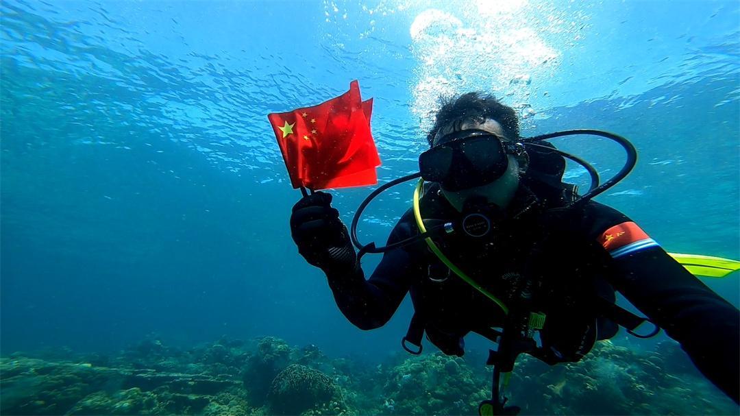 圖為潛水員在水下展示國旗。