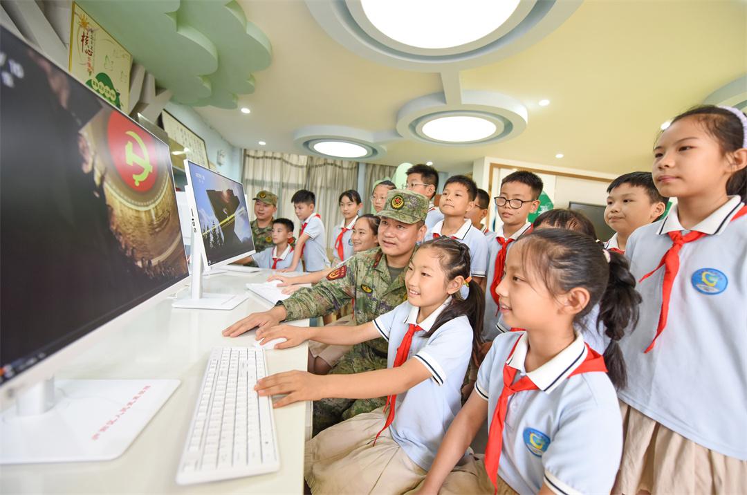 圖為合肥市廬陽區(qū)民兵與學生一起觀看紅色紀錄片《薪火傳承》。