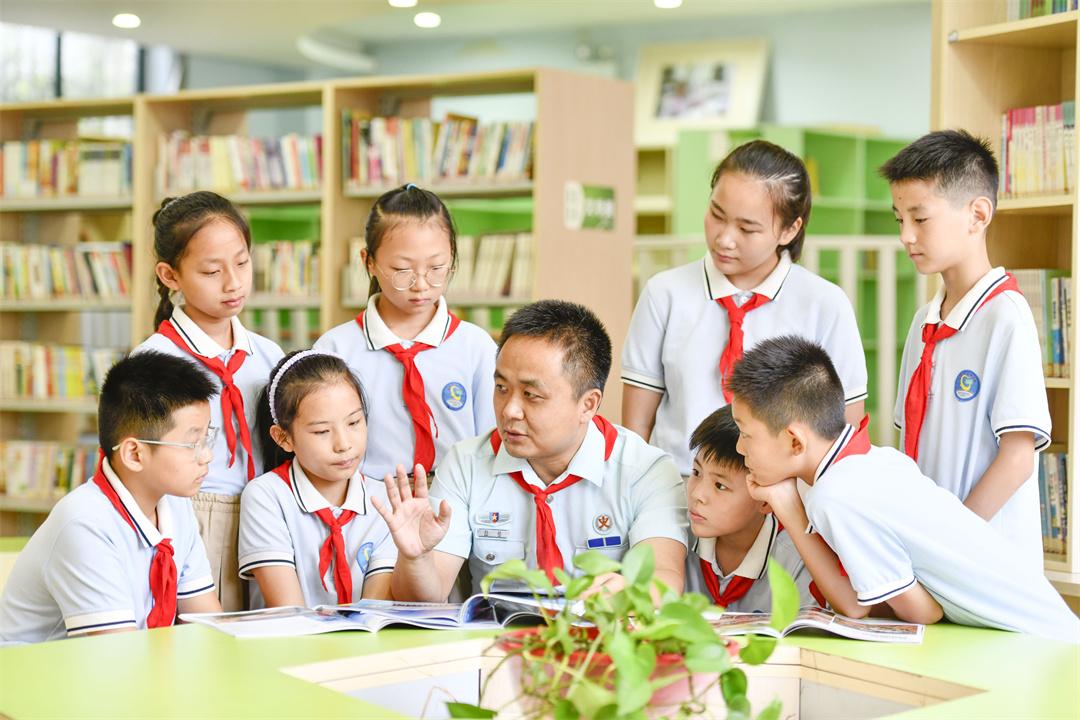 圖為合肥市廬陽區(qū)人武部文職人員孫勁在向?qū)W生普及國防知識。