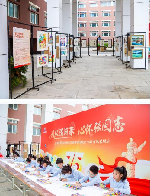 戶外展區(qū),“童心繪盛世,丹青耀中華”書畫作品展率先引爆全場。國畫、油畫、素描、彩鉛、漫畫……一幅幅由學(xué)生精心創(chuàng)作的作品琳瑯滿目,色彩斑斕,每一筆都透露出孩子們對祖國的深情厚意和對美好生活的無限憧憬。特別是那幅由16位學(xué)生共同手繪的7.5米長的巨型畫卷,如同絢麗的彩虹,將孩子們的夢想與祖國的未來緊緊相連。