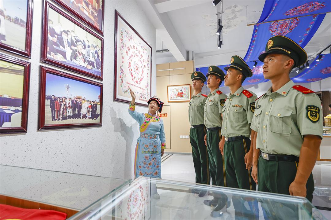 圖為武警官兵與村里的繡娘合唱羌族歌曲。