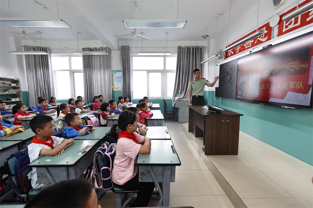 圖為武警北川中隊(duì)赴駐地小學(xué)開展“愛國主義教育進(jìn)校園”主題活動。