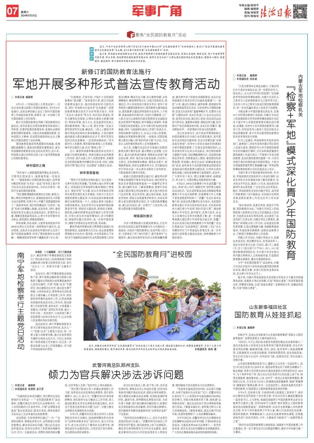 連日來,軍地聯(lián)合積極創(chuàng)新方法手段,組織開展新修訂的國防教育法普法宣傳、參觀紅色場館、緬懷先烈、青少年進(jìn)軍營等內(nèi)容豐富、形式多樣、特色鮮明的國防教育實踐活動,教育引導(dǎo)官兵和廣大群眾強(qiáng)化國防觀念和憂患意識,增強(qiáng)關(guān)心國防、熱愛國防、建設(shè)國防、保衛(wèi)國防的思想自覺和行動自覺。