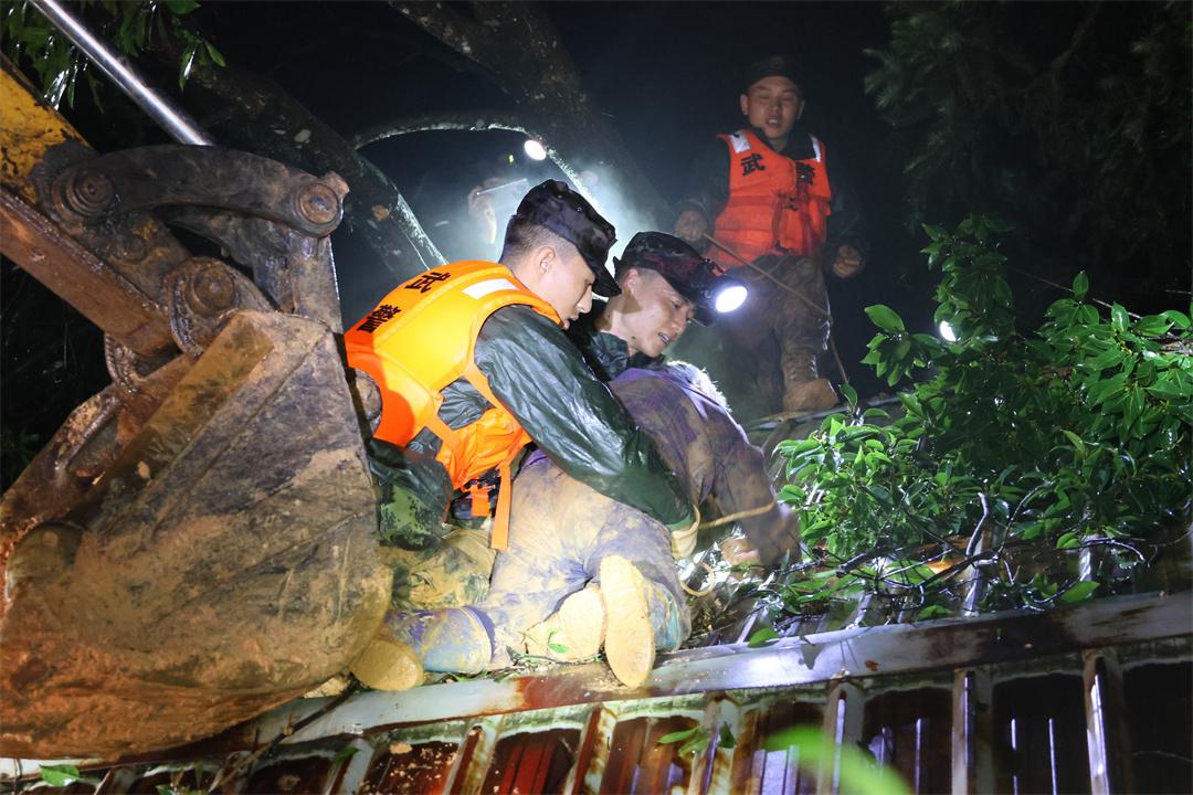 今年6月,受持續(xù)強(qiáng)降雨影響,上杭縣多地發(fā)生山體滑坡、內(nèi)澇等災(zāi)情。上杭中隊(duì)接到當(dāng)?shù)卣仍埱蠛?,中?duì)長周徐聰立即帶領(lǐng)11名官兵挺進(jìn)受災(zāi)嚴(yán)重的上杭縣中都鎮(zhèn)。得知一處倒塌房屋內(nèi)埋著兩名老人,指揮員在確定老人位置后,迅速判定情況,指揮救援。
