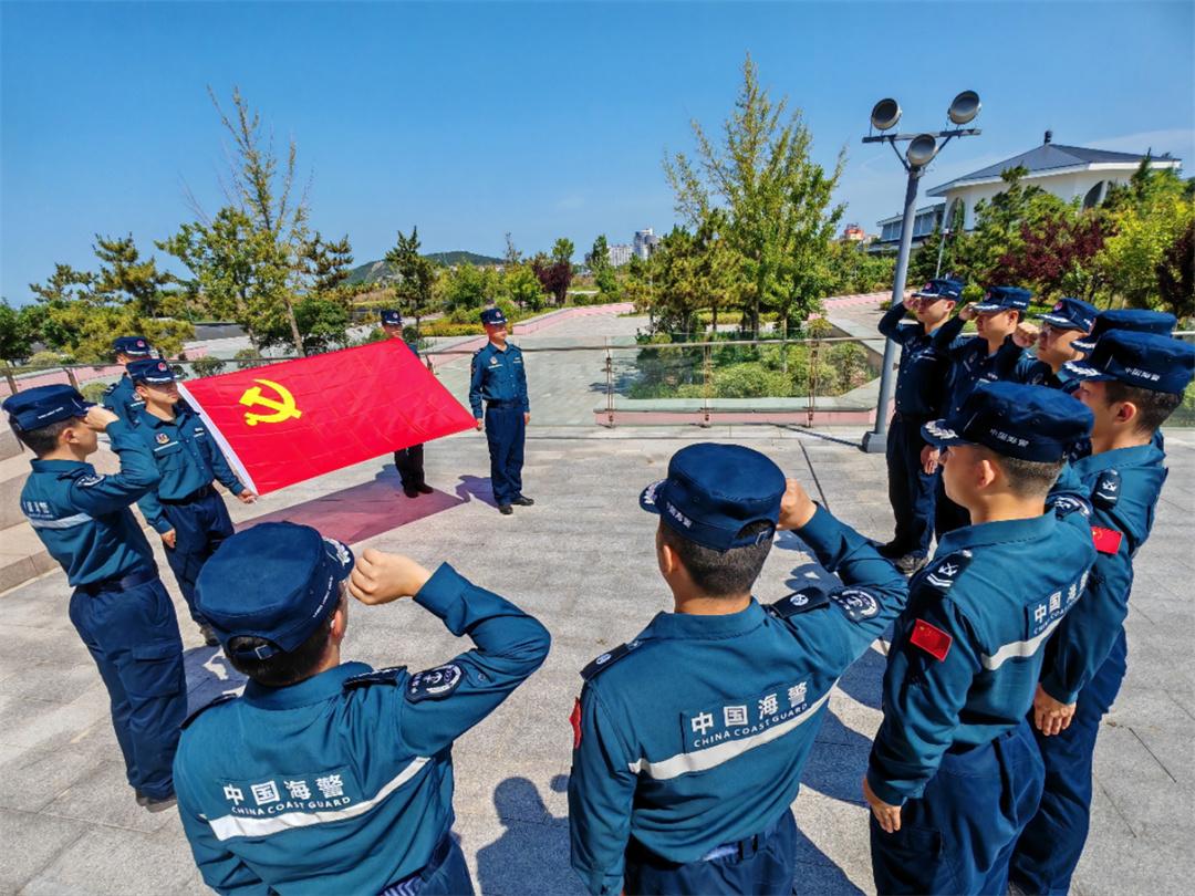 圖為山東煙臺海警局長島工作站組織執(zhí)法員重溫入黨誓詞。盧煜萱 攝