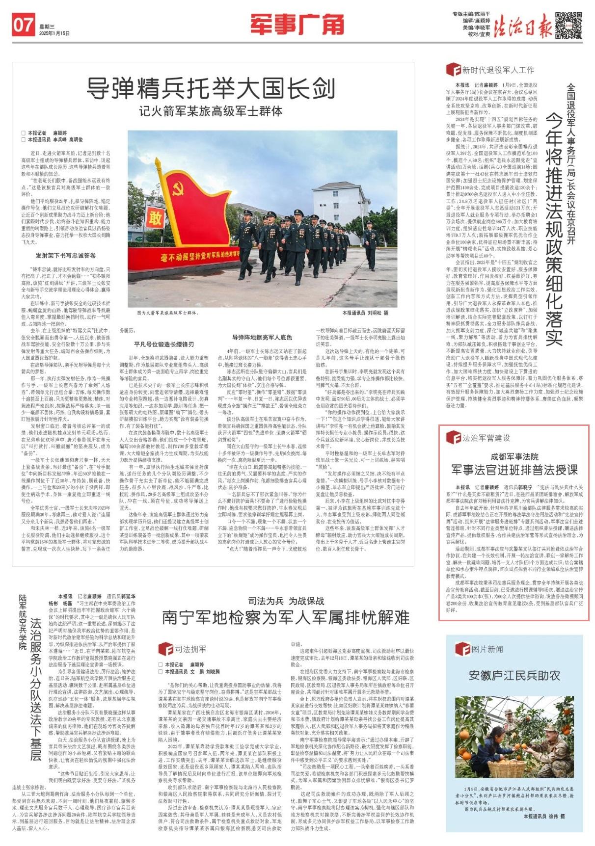 活動(dòng)期間,成都軍事法院與武警某支隊(duì)簽訂共同推進(jìn)依法治軍合作協(xié)議,在共建一個(gè)長(zhǎng)效機(jī)制、開展一輪法治宣講、聯(lián)創(chuàng)一家解紛工作室、解決一批疑難問(wèn)題、培養(yǎng)一支人才隊(duì)伍5個(gè)方面達(dá)成共識(shí);結(jié)合案轄單位和承辦案件特點(diǎn)規(guī)律,首次試點(diǎn)探索不同行業(yè)領(lǐng)域單位法治宣傳教育模式。